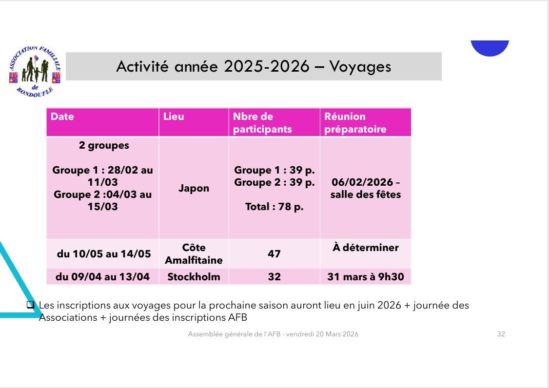 Comme l'an passé, l'AFB souhaite vous proposer différents voyages.