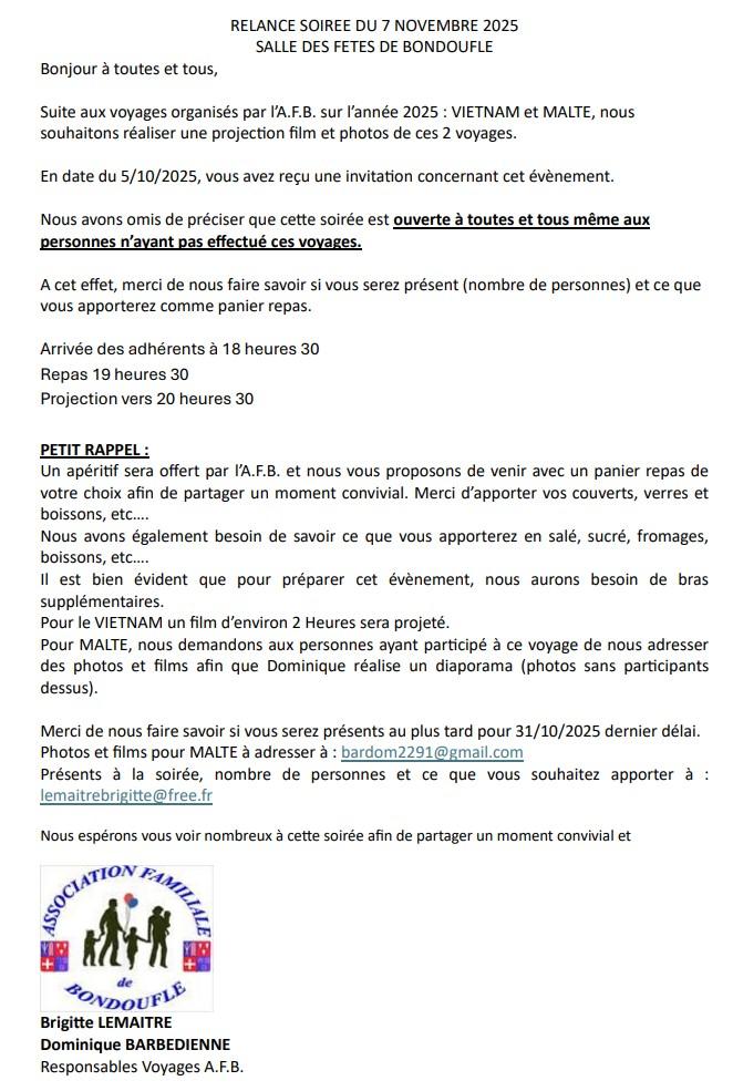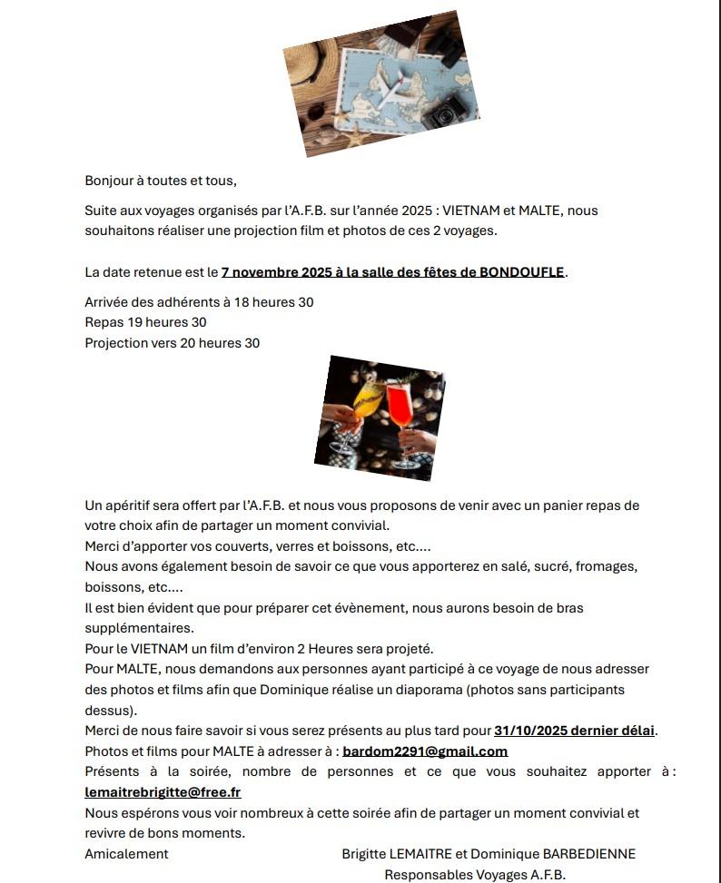 L'AFB rappelle qu'elle organise une soirée VOYAGES le 7 novembre 2025 (voir PJ) .